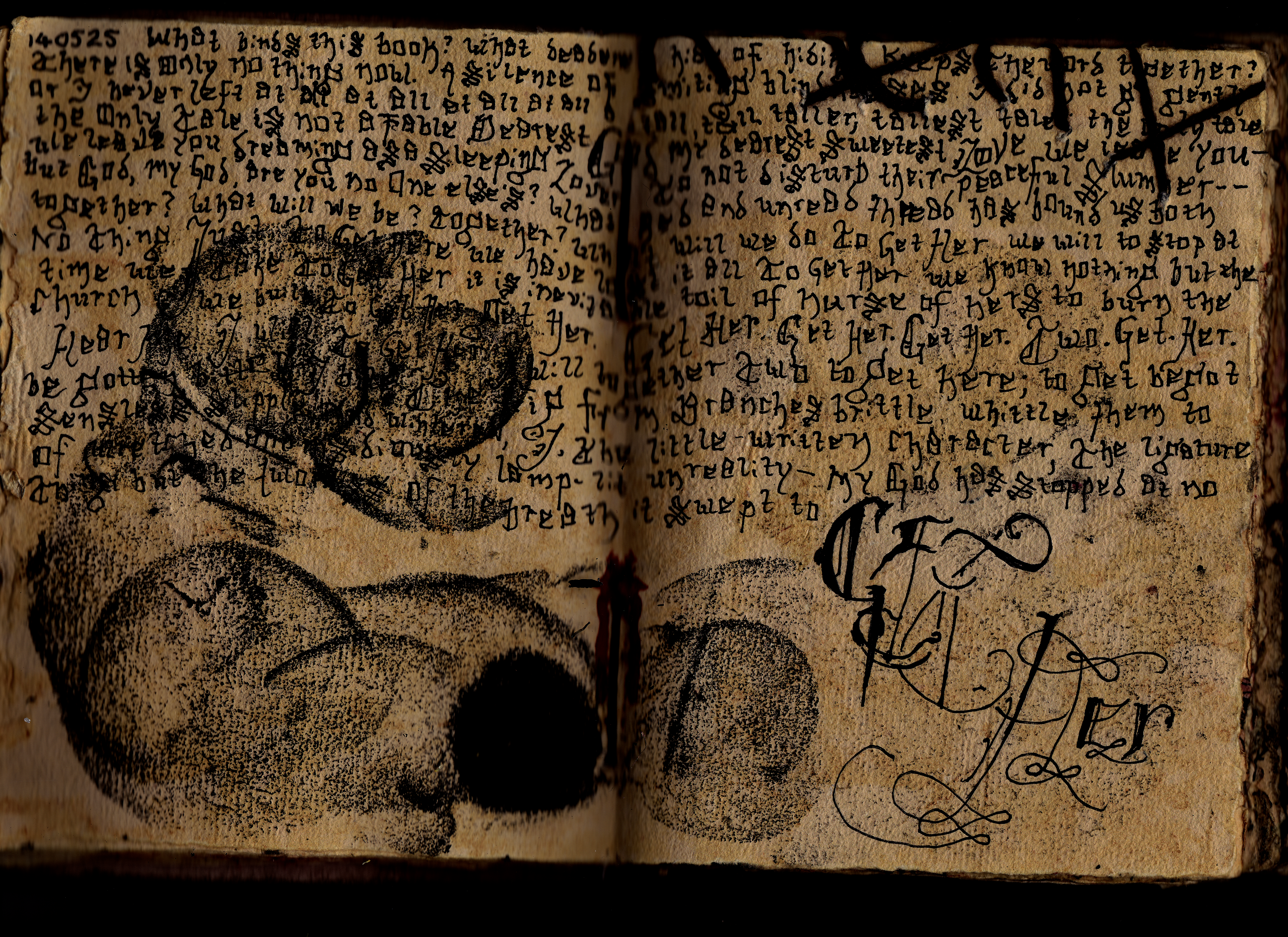 Two epistolary grimoires bookend the room — Ingestion in the north, Defecation in the south. In these grotesque leather-bound accounts of unravelling, Petal’s hypergraphia born of psychosis becomes the medium, capturing the sound and visual works in time — both before and after her admission.