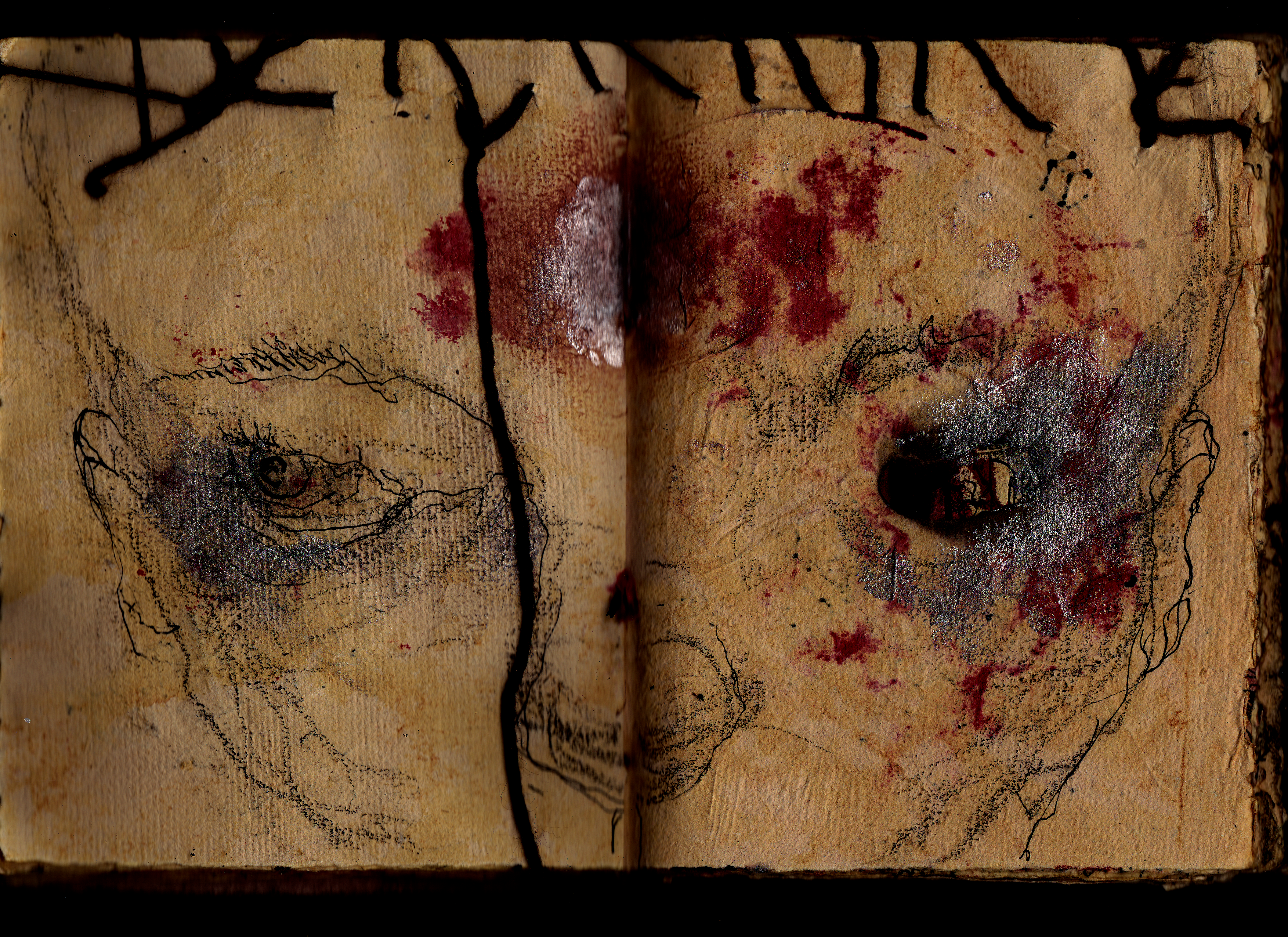 Scarred by burning, chiselling, scratching, nailing, and stitching, the visual pieces sew together the artist’s cycle of trauma.
